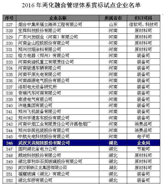 近日,工业和信息化部办公厅发布《关于公布2016年两化融合管理体系贯标试点企业名单的通知》,通知公布了600家“2016年两化融合管理体系贯标试点企业”名单,天高股份荣列榜单。“两化融合管理体系贯标试点企业”针对全国企业进行择优认定,评选包括企业自评、呈送申报材料、现场评审、武汉市经济和信息化委员会推荐四大环节。作为中国焊接材料研发、制造的龙头企业,