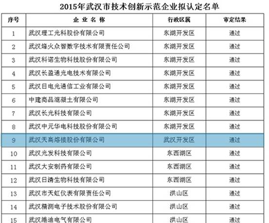 天高股份入围“武汉市科技创新示范企业”和“武汉市企业科技创新奖”