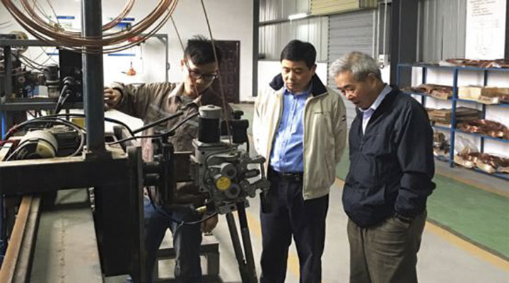 在董事长汪小根的带领下,史教授实地考察了技术中心并现场观看UFB法焊接工艺演示。UFB法这种创新工艺让他大呼惊喜和意外,他认为公司目前实施的UFB法,高效简易可靠,很有应用前景并对公司的创新精神表示赞许。史教授与技术人员讨论如何应用这种工艺解决U肋焊接长期以来存在的缺陷,对公司后续的科研开发工作提了很多积极指导性意见,为公司桥梁焊接技术未来发展指明了方向。